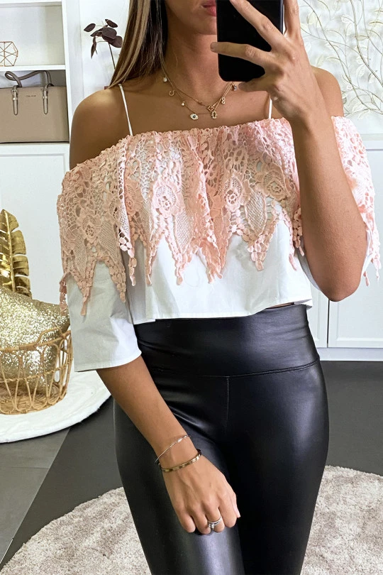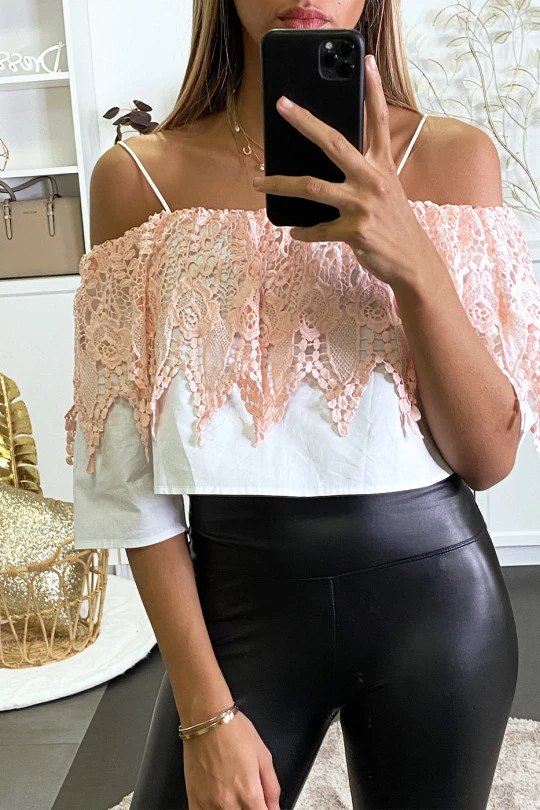 Sublime top ou crop top en matière chemise avec une doublure originale en crochet.